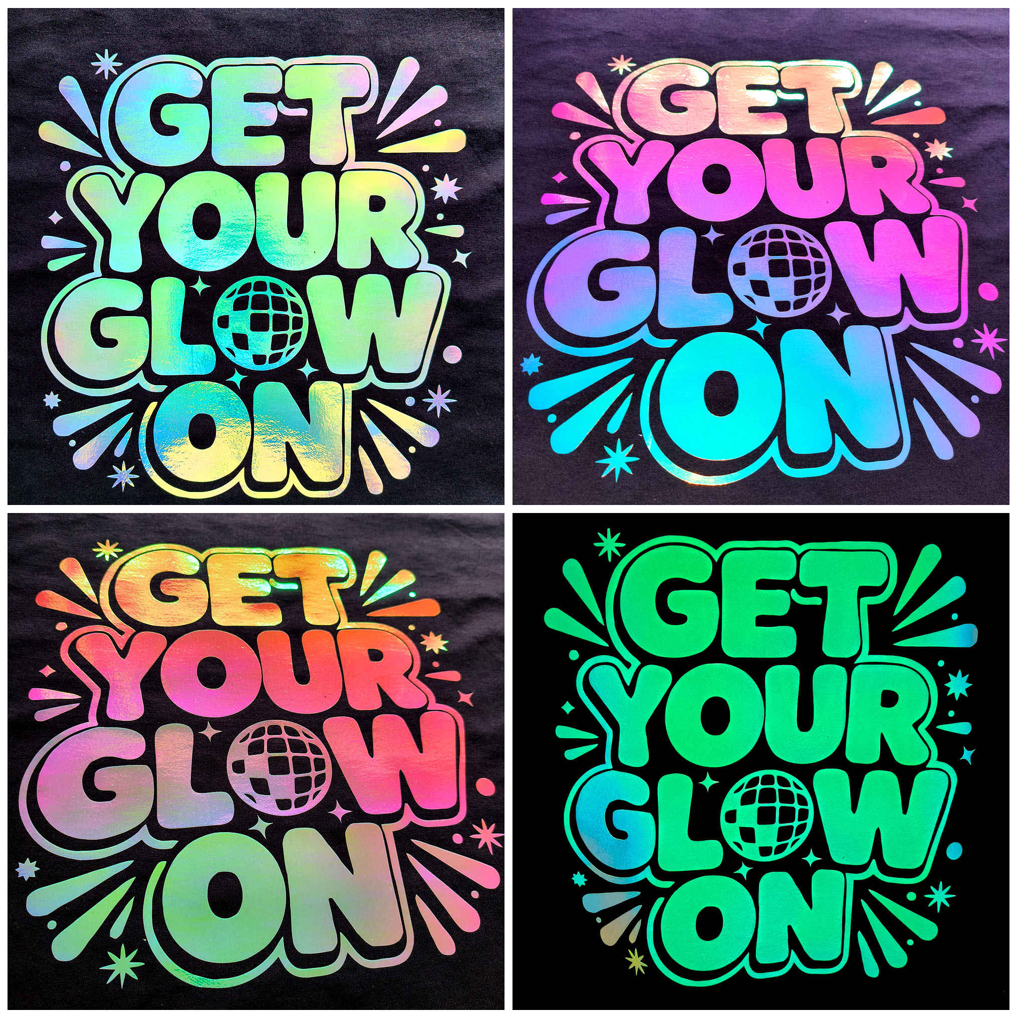 Az Holo Rainbow fólia világosban ezüstös, színjátszós hatású, illetve tükörfényes. Sötétben szintén élénk zölden világít.